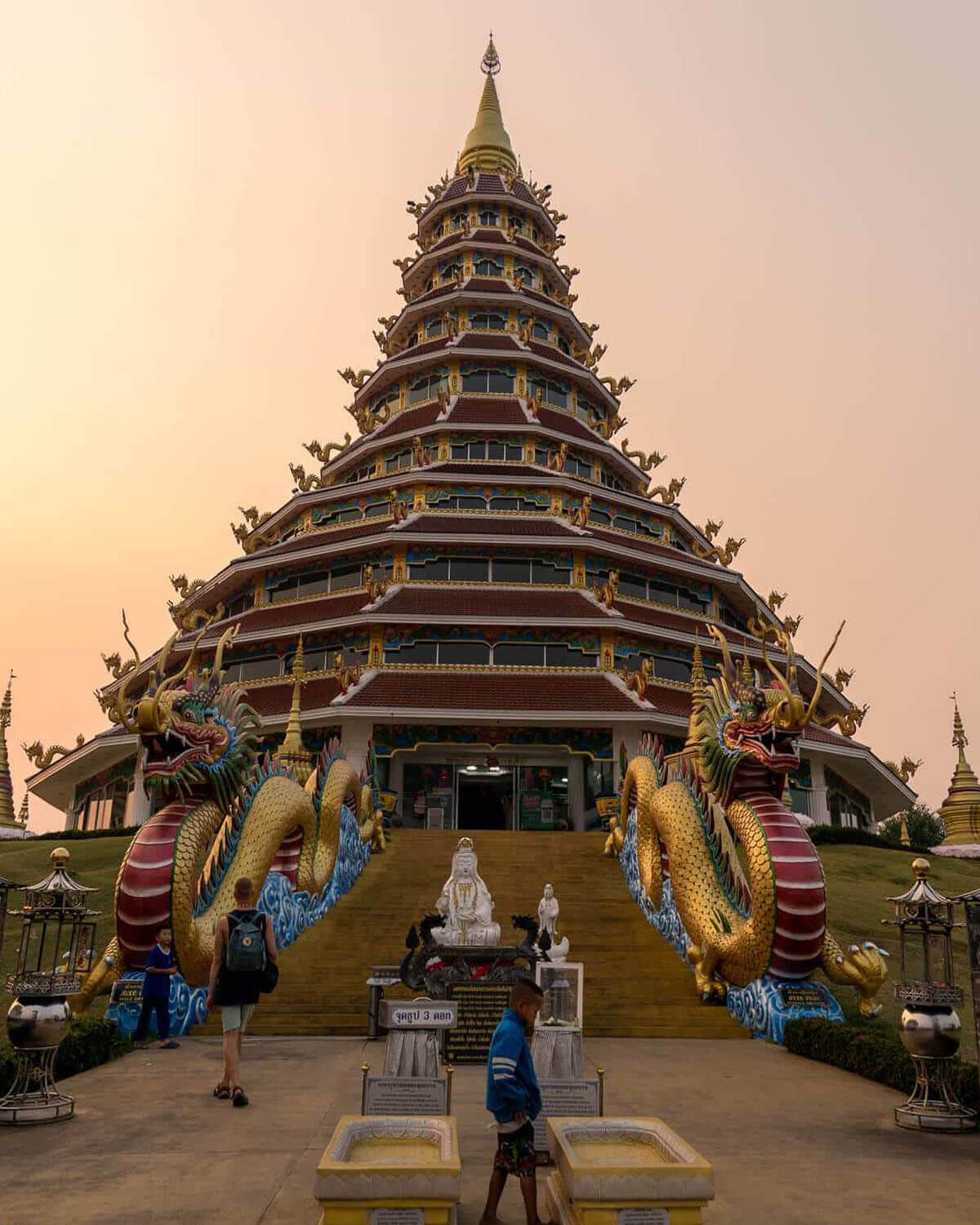 At Wat Huay Pla Kang, a 25 story white Guan Yin statue rises above the hills while a nine tier Chinese pagoda offers panoramic mountain views. The atmosphere is peaceful, spacious, and perfect for taking in the landscape.