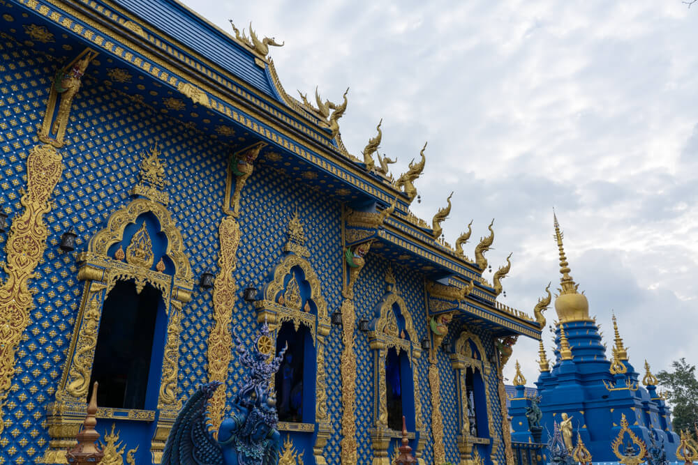 From white to blue: Wat Rong Suea Ten was designed by Chalermchai's protégé and takes a different approach. The entire temple glows in shades of sapphire and gold, with a massive white Buddha presiding over an interior that feels like stepping into a painting. It's less crowded than the White Temple, quieter, and just as breathtaking.
