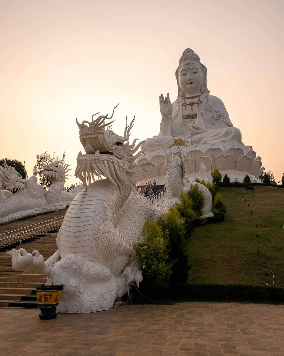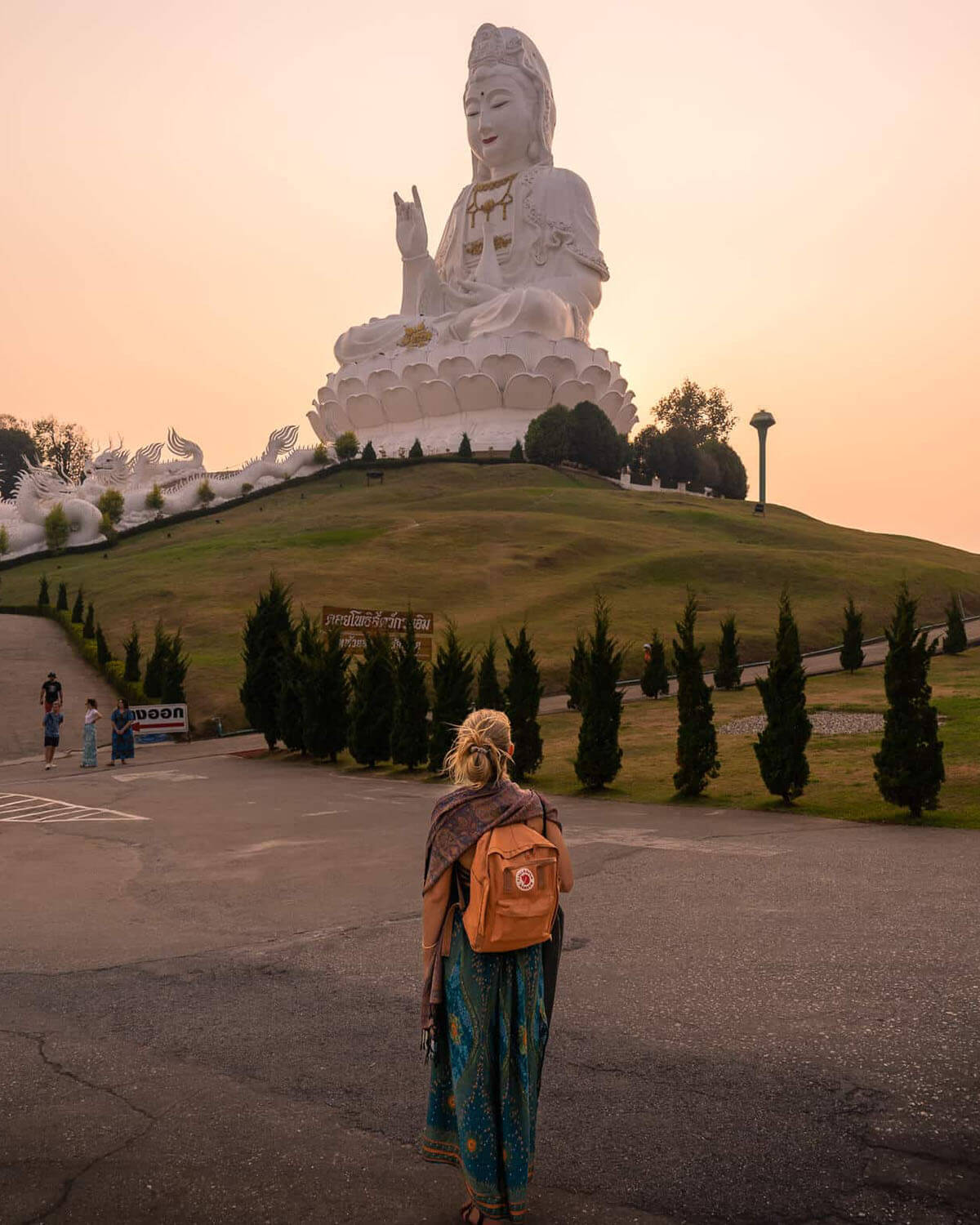 At Wat Huay Pla Kang, a 25 story white Guan Yin statue rises above the hills while a nine tier Chinese pagoda offers panoramic mountain views. The atmosphere is peaceful, spacious, and perfect for taking in the landscape.