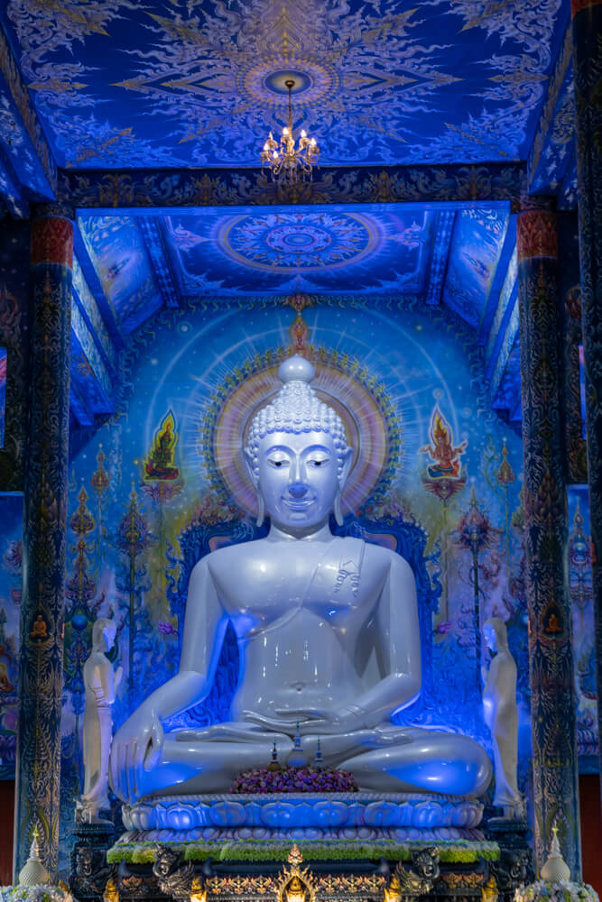 From white to blue: Wat Rong Suea Ten was designed by Chalermchai's protégé and takes a different approach. The entire temple glows in shades of sapphire and gold, with a massive white Buddha presiding over an interior that feels like stepping into a painting. It's less crowded than the White Temple, quieter, and just as breathtaking.